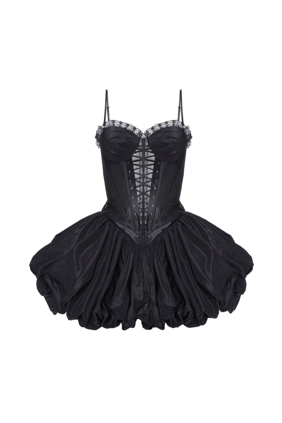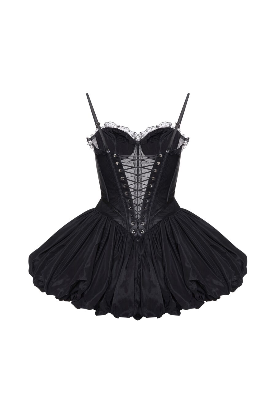Sophisticated corset dress with heart-shaped neckline, tiny straps and structured lace-up bodice. The voluminous puffy skirt makes this dress synonymous with playfulness and ease. Available in 2 colors: black and ivory.