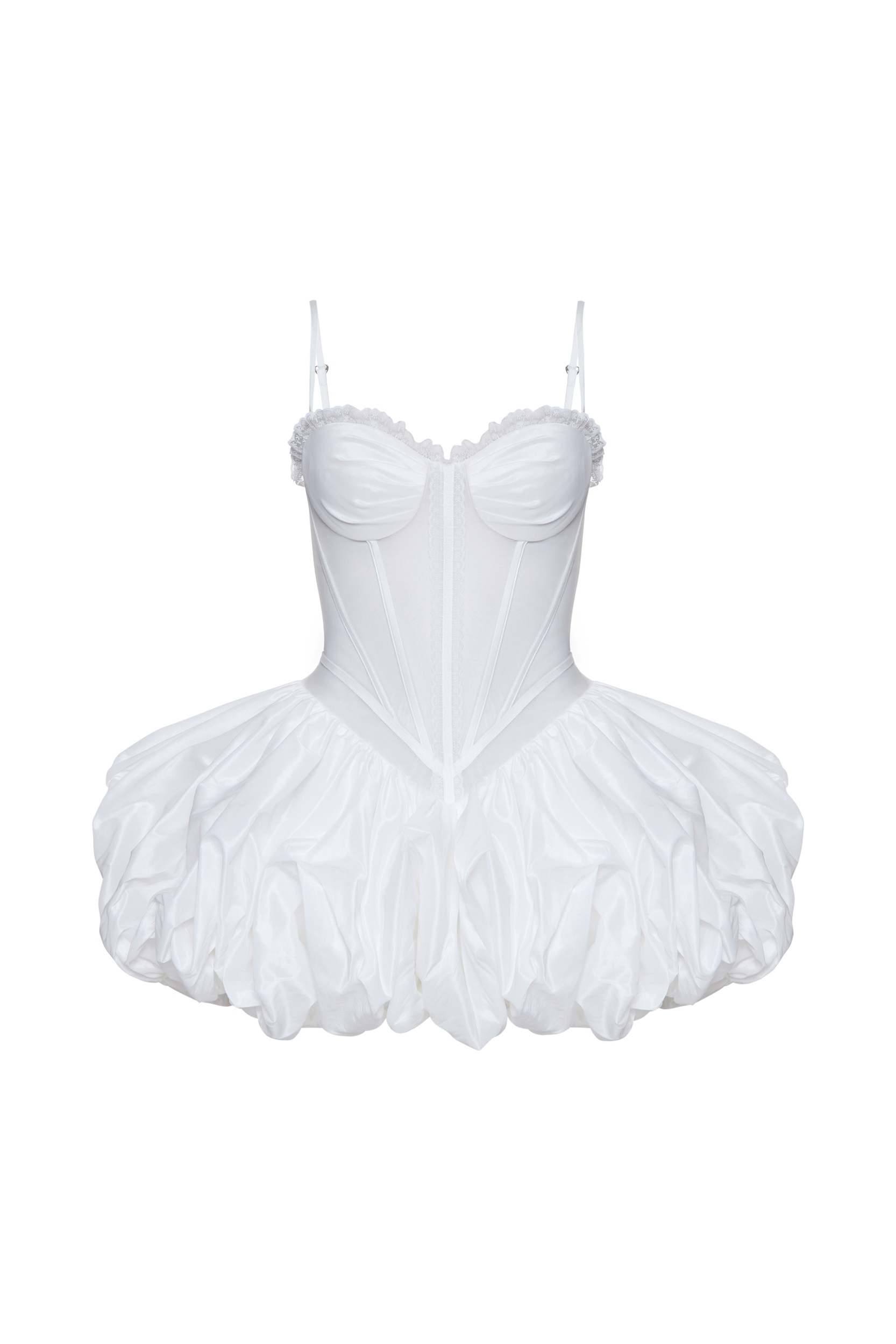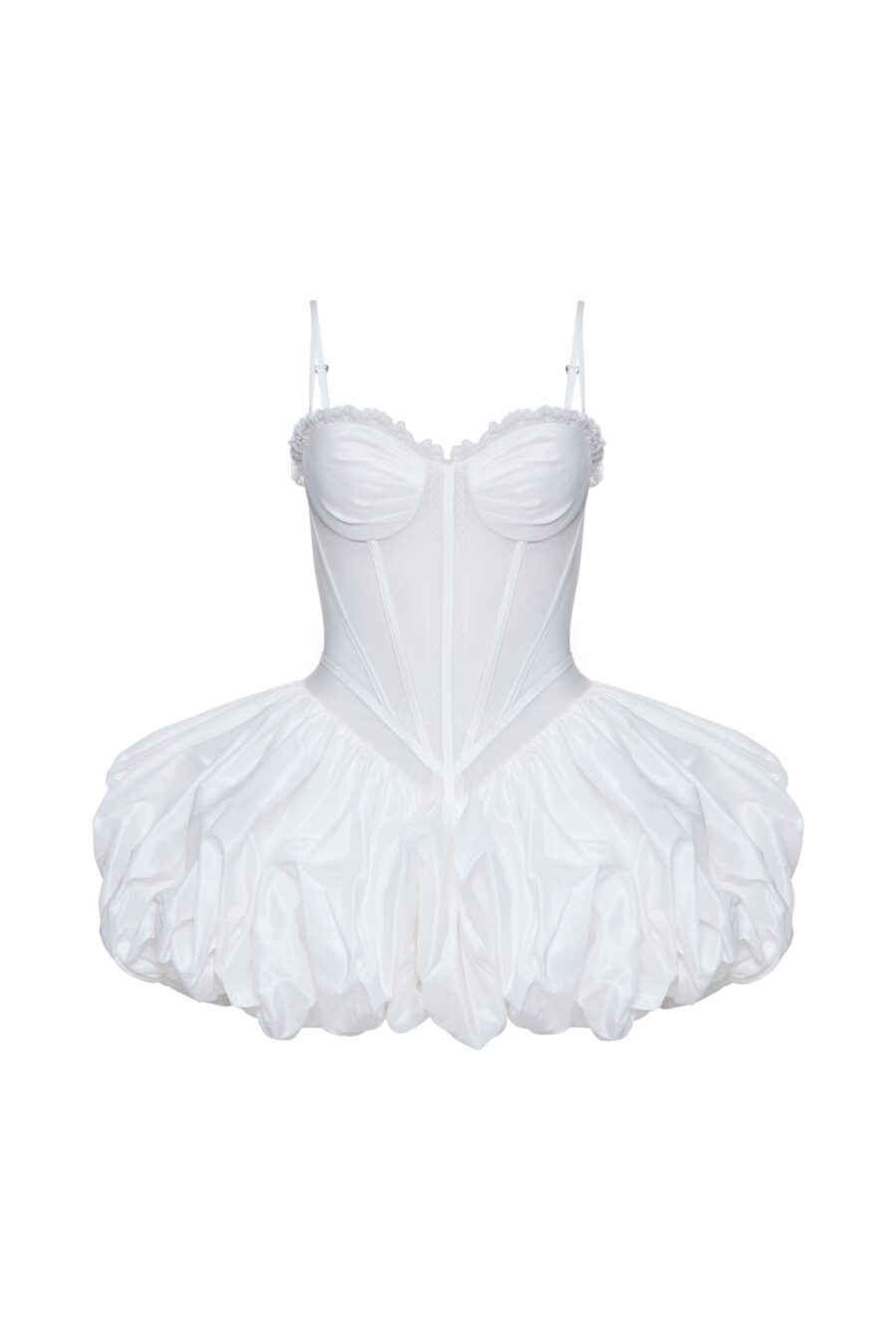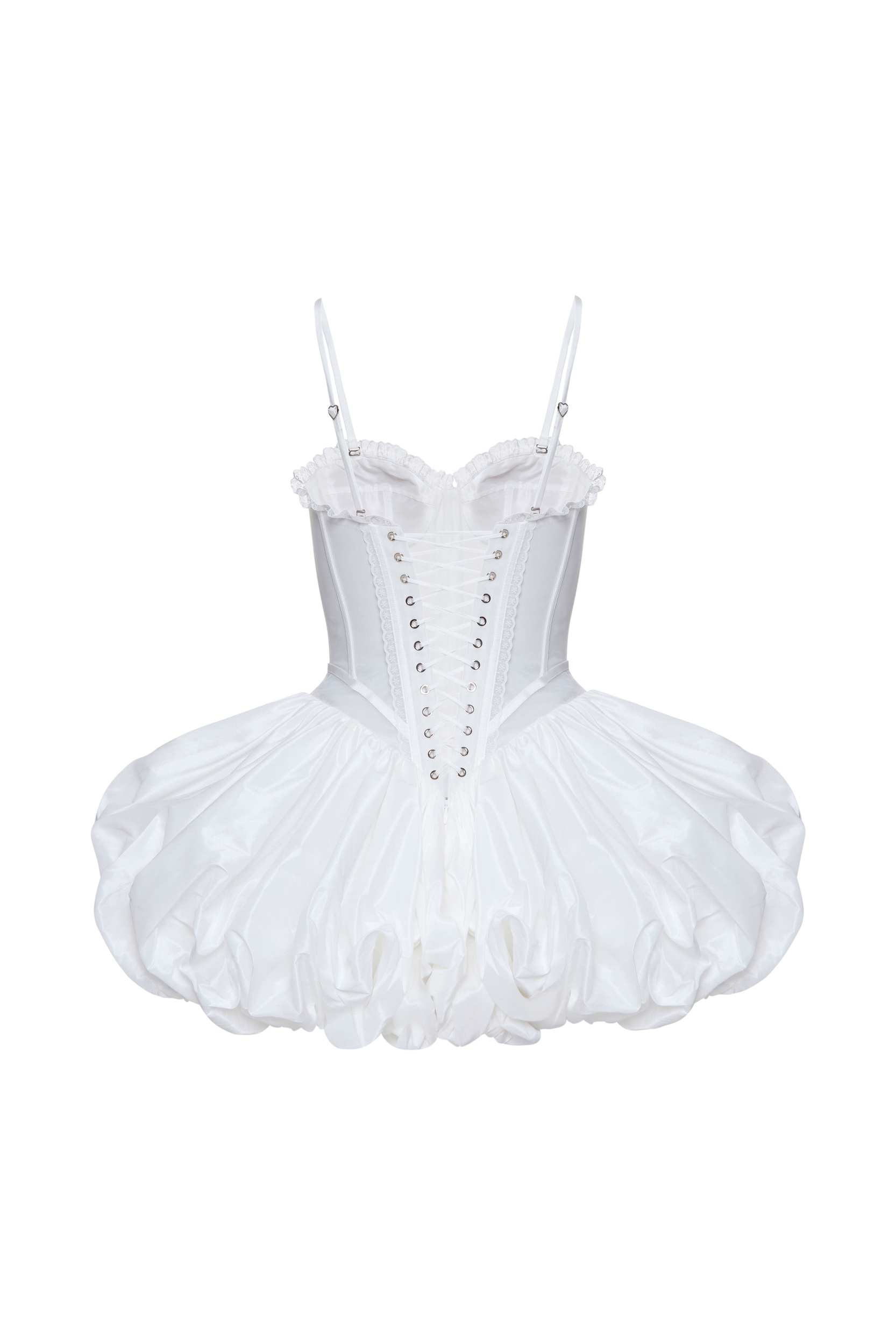 Sophisticated corset dress with heart-shaped neckline, tiny straps and structured lace-up bodice. The voluminous puffy skirt makes this dress synonymous with playfulness and ease. Available in 2 colors: black and ivory.