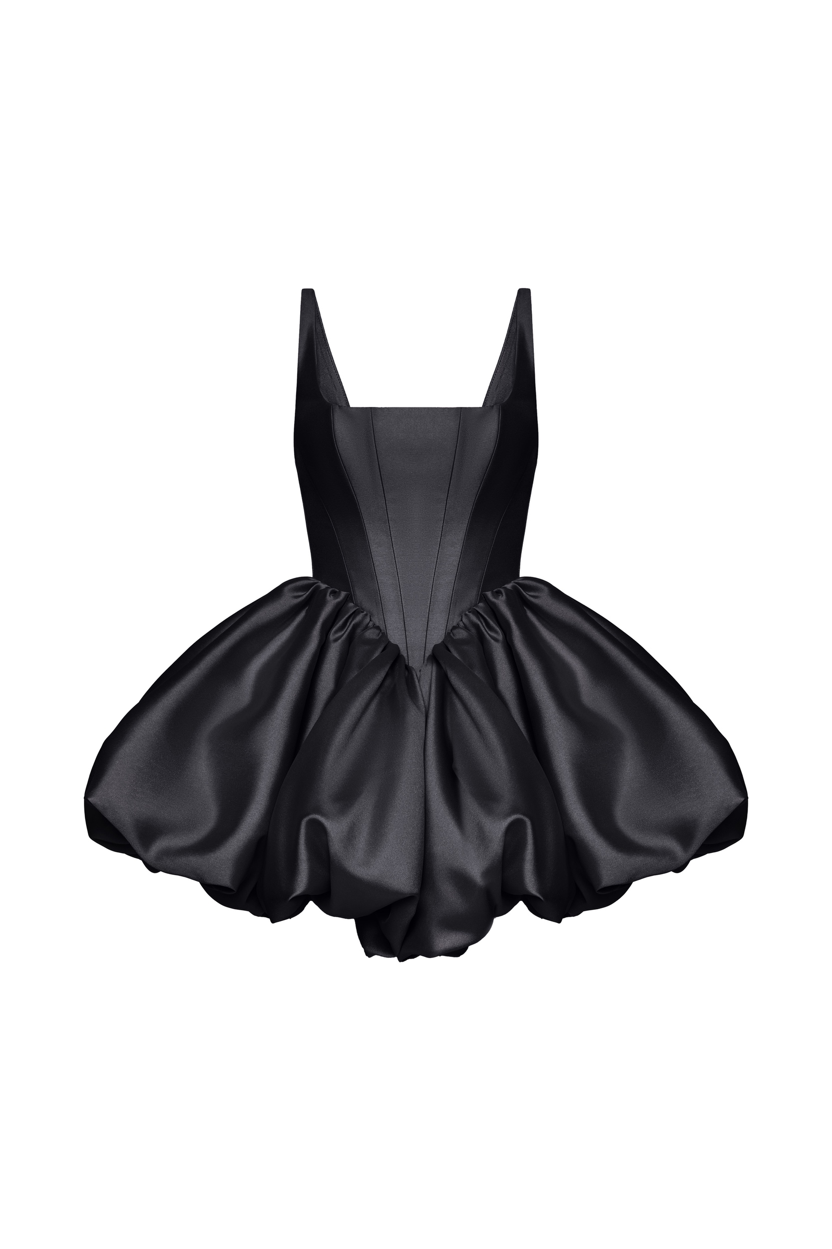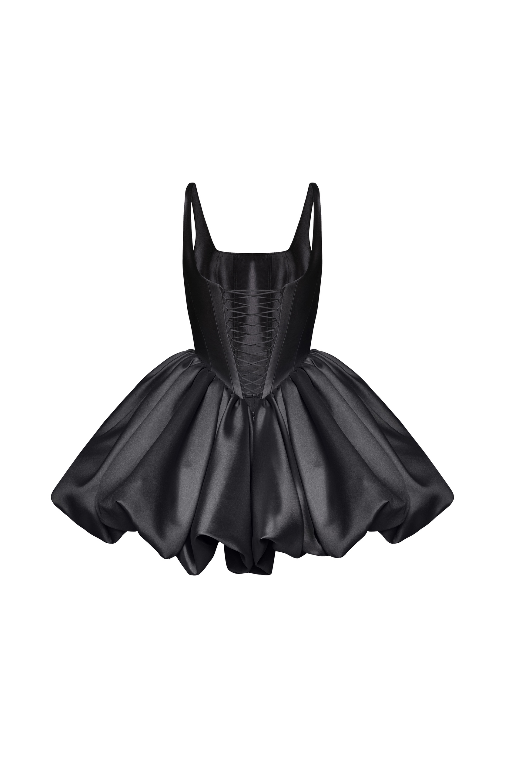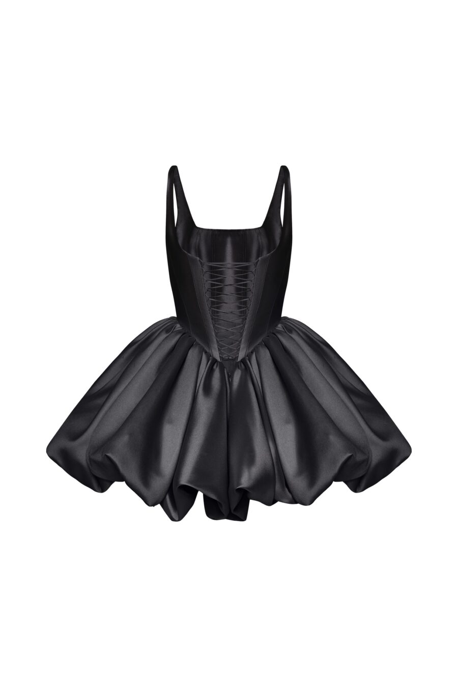 Flower-like smooth mini dress with a lace-up corset base. Straight neckline and simple straps give a touch of modesty while the puffy skirt adds ease to the outfit. Available in 3 colors: black, ivory and pink.